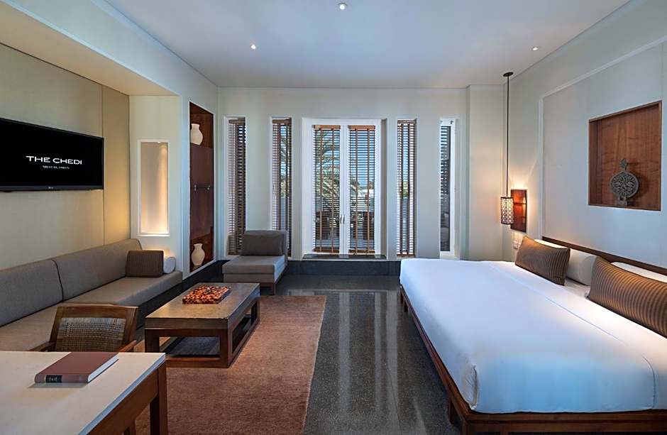 With views that look into the palm fringed gardens and neutral hued Asian style minimalism and Omani details, enjoy a space with high ceilings, oversize windows welcoming natural light, sitting area with built-in sofa bench, work desk and a Nespresso machine.